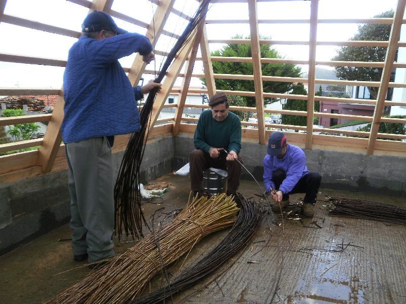 Sobre os feixes são colocadas as varas na horizontal, que são amarradas com os vimes, comprimindo a palha para que não se solte. Esta primeira camada tem sensivelmente 15 cm de espessura e pode ser feita com palha de centeio, por ter um aspeto mais regular.